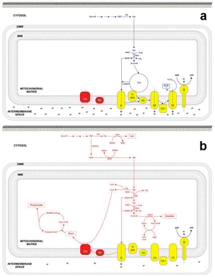 Considering the above, we can note that anaerobiosis-specific reactions are those catalyzed by FRD and ASCT. However, it is the presence of RQ that appears to be the only real difference between aerobic and anaerobic energy metabolism [114], as FRD expression has been described in cancer cells [115,116], while ASCT is an enzyme homologous to other transferases [105,117,118].