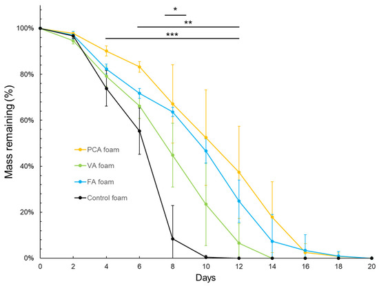 Gravimetric analysis of SMP foams in accelerated oxidative degradation media (20% H2O2) over 20 days. n = 4, mean ± standard deviation displayed, * p < 0.05 between VA foam and control foam, ** p < 0.05 between FA foam and control foam, *** p < 0.05 between PCA foam and control foam.