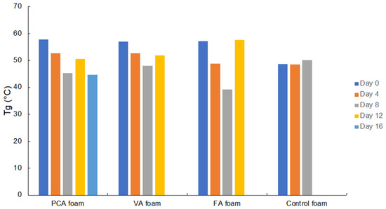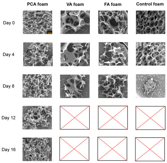 Micrographs of pore structures of SMP foams up to 16 days in accelerated oxidative media are shown in Figure 2. SEM images of all foams during the first four days of oxidative degradation show complete pore structure with minimal pore collapse or strut breakage. The mass remaining of all foams was >75% at this point, corroborating the microscopic analysis with the gravimetric analysis. The pore structure of the PCA foam was relatively stable over the full 16 days, with visible pores still present at day 16. Based on microscopic analysis, the PCA foam shows the best oxidative stability in 20% H2O2, which was supported by the gravimetric results. The VA and FA foams maintained pore structures until the 8th day of oxidative degradation. In contrast, only some fragments of control foams were visible in the SEM image on day 8, with evidence of complete pore collapse that primarily occurred between days 4 and 8. It should be noted that microscopic analysis was carried out on separate samples from the gravimetric analysis, and the microscopic analysis samples were cut at each time point. Thus, although there was mass remaining in the FA foam at 12 and 16 days in Figure 1, the cut microscopic analysis sample had completed degraded by this time.