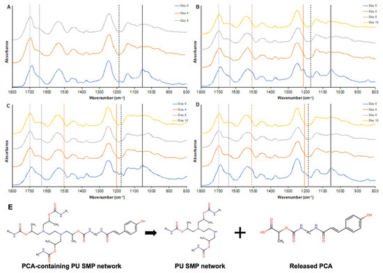 Spectroscopic analysis of (A) control, (B) PCA, (C) VA, and (D) FA SMP foams in 20% H2O2 over 12 days via ATR-FTIR. The grey dashed line shows the urethane C=O peak shift from 1680 cm−1 to 1690 cm−1 and the grey solid line shows the urea C=O peak at 1636 cm−1. The black dashed line at 1165 cm−1 and the black solid line at 1050 cm−1 shows the tertiary amine peak. The orange dashed line shows the C=C of the phenolic ring at 1500 cm−1 and the orange solid line shows the C–CH of the phenolic ring at 1180 cm−1. (E) Schematic of the scission of the tertiary amines of HPED leading the release of incorporated PCA from the PCA foam network in the accelerated degraded process. VA and FA share a similar release process from PU foams.