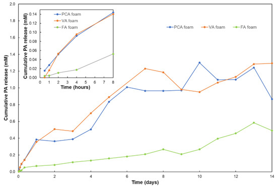 Analysis of cumulative PA release from SMP foams in PBS over 14 days. PA concentrations were determined using ultraviolet–visible (UV–Vis) spectrophotometry.