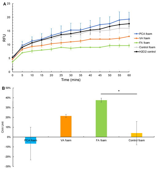 Cellular antioxidant analysis after PA foam and control foam incubation in H2O2. (A) H2O2-induced oxidation of DCFDA to DCF within Caco-2 cells over 60 min after incubation with SMP foams, (B) Cellular antioxidant activity (CAA). n = 3, mean ± standard deviation displayed, * p < 0.05 between H2O2 exposed to FA foam and control foam.