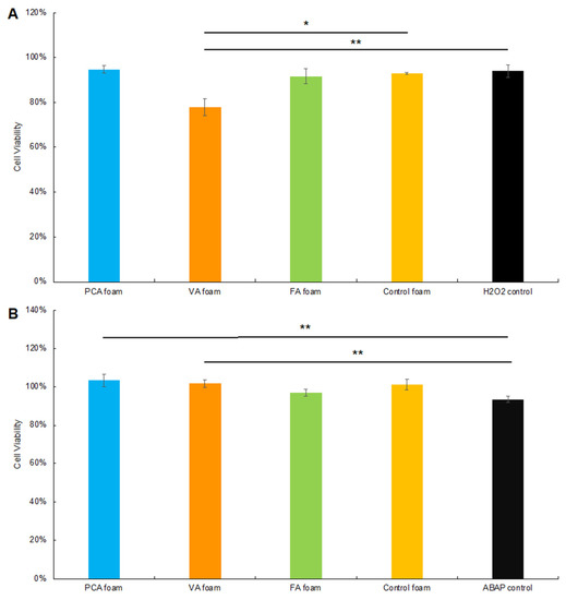 Caco-2 cell viability during the DCFDA/H2DCFDA assay process with SMP foams in (A) H2O2 and (B) ABAP. n = 3, mean ± standard deviation displayed, * p < 0.05 between PA foams and control foam, ** p < 0.05 between PA foams and ROS control.