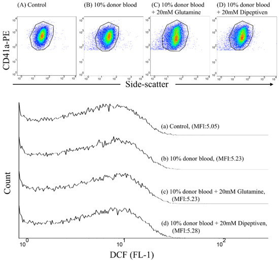 Donor pRBCs were added to recipient-washed platelets to form 1%, 5%, or 10% (v/v) mixtures at 37 °C for 5 min. We also treated 10% (v/v) mixtures with glutamine (20 mM) or dipeptiven (20 mM) within 1 min to examine whether DCF fluorescence generation can be inhibited at 37 °C for 5 min. FITC-labeled mouse IgG1κ and PE-labeled mouse IgG1κ served as background controls. To quantify ROS generation, the samples were stained with a saturating concentration of the DCFH-DA and anti-CD41a-PE monoclonal antibodies and incubated at approximately 22–28 °C in the dark for 20 min. Individual platelets were identified through anti-CD41a-PE immunofluorescence in a logarithmic-scaled dot plot and side scatter (granularity characteristics). ROS generation was quantified by measuring the increase in DCF fluorescence (Figure 1).