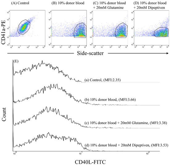 Flow cytometric analysis of platelet CD40L expression. Individual platelets were identified by their characteristic side-scatter properties (granularity; x-axis) and positive labeling with a platelet-specific monoclonal antibody (CD41a-PE; y-axis). Dot plot of the fluorescence of (A) control, (B) 10% donor blood (v/v), (C) 10% donor blood (v/v) mixed with 20 mM glutamine, and (D) 10% donor blood (v/v) mixed with 20 mM dipeptiveit’s the (E) Overlay of the histograms for (a) control, (b) 10% donor blood (v/v), (c) 10% donor blood (v/v) mixed with 20 mM glutamine, and (d) 10% donor blood (v/v) mixed with 20 mM dipeptiven.