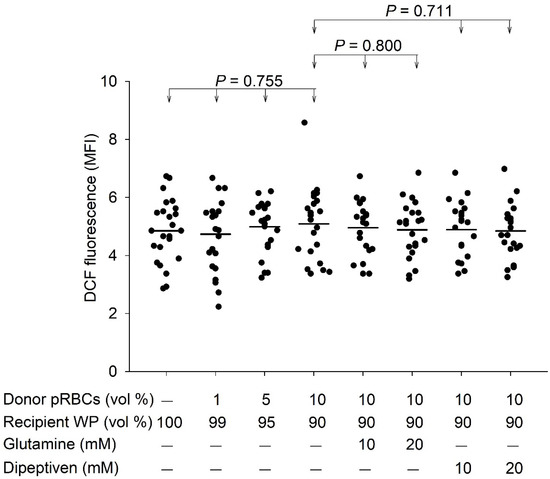 DCF fluorescence generation after the mixing of pRBCs and washed platelets and response to antioxidant treatment (n = 22). MFI, mean fluorescence intensity; pRBCs, packed red blood cells; WP, washed platelets; vol, volume. Mean values are indicated by horizontal lines.