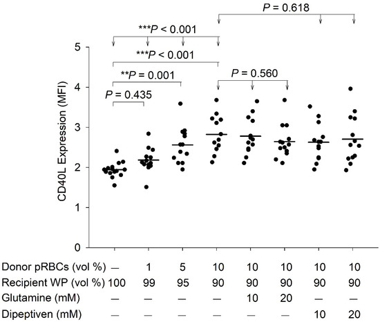 2.5. Quantification of CD40L Expression upon Mixing pRBCs and Washed Platelets, Subsequent to Glutamine or Dipeptiven Treatment of Washed Platelets