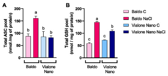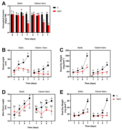 Accordingly, a stronger and more precocious reduction of chlorophyll content, a parameter related to the state of leaf chlorosis and photosynthetic efficiency, was more pronounced in Vialone Nano at 4 days after salt treatment than in Baldo. Treated Baldo plants showed an evident reduction only later, starting 7 days after salt treatment (Figure 2A).