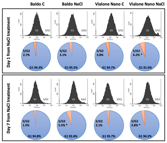 Cell cycle regulation in rice roots subjected to salt stress. Flow cytometric analysis of cell cycle of Baldo and Vialone Nano roots in control and salt stress conditions at 1 day and 7 days after salt treatment. All samples were stained with PI. Cell cycle progression in apical root meristem in response to salinity treatment. The analysis reflects the relative number of cells according to DNA content in each cell. The first peak (2n) represents the G1-phase and the second peak (4n) represents the S/G2 phase. Corresponding diagrams report the proportion of cells in G1 and S/G2 phases in Vialone Nano and Baldo under control and stress conditions. Data are presented as an average estimated from each treatment in five biological replicates with 30,000 events each. Student’s t-test was used to evaluate the significant variations between control and treated conditions for each variety. The reported values are the means of four independent experiments ± standard deviation. Statistically significant variations are shown (*) with p-value ≤ 0.05.