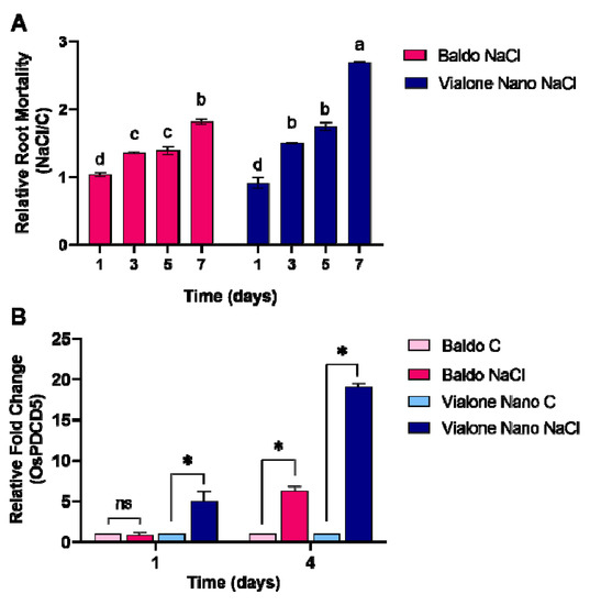 In addition, the expression of programmed cell-death 5 (OsPDCD5), a gene known to be involved in programmed cell death (PCD) processes under different abiotic stresses such as cold temperature and UV-B irradiation [36,37,38], was examined one and four days after salt exposure in the root apparatus. OsPDCD5 presented a differential regulation of the gene expression that was upregulated both in Baldo and in Vialone Nano after salt stress but with a different timing and a different relative fold change. After one day of salt exposure, an increase in the relative fold change occurred specifically in Vialone Nano, while in Baldo this increase only occurred later (Figure 4B).