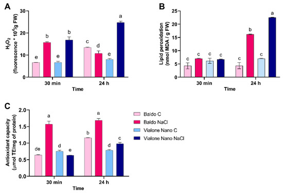 Therefore, an evaluation of the H2O2 accumulation and antioxidant metabolism in Baldo and Vialone Nano plants, both under control conditions and after salt exposure, was performed at a short time after stress application.