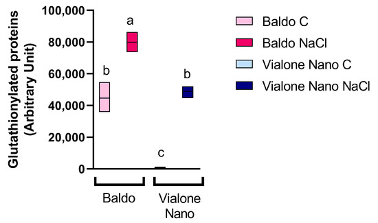 Interestingly, a marked difference in S-glutathionylated proteins was also observed between Baldo and Vialone Nano under control conditions. In Baldo, the level of S-glutathionylated proteins was much higher in comparison to what was noticed in Vialone Nano roots. Moreover, the glutathionylated protein level observed in Vialone Nano-treated plants was comparable to that of Baldo grown under control conditions (Figure 8).
