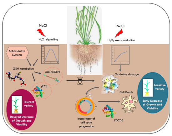 Redox strategy underpinning salt tolerance in rice. A differential modulation of the redox balance is pivotal for the protection against salt stress in the tolerant rice variety. In Baldo, a rapid and effective modulation of the antioxidative systems allows a delay of the oxidative damage to the cellular components and consequent impairment of cell-cycle progression and cell viability due to a shift toward an ROS signaling mode instead of a damaging one. In this context, glutathione metabolism was identified as a possible pathway, which contributes to conferring salt tolerance on rice. A variety-specific modulation of the expression of the enzyme γ ECS and regulation, at a post-transcriptional level, of sulfur assimilation, mediated by osa-miR395, can contribute to the delayed decrease in plant growth and viability observed in tolerant Baldo rice variety.