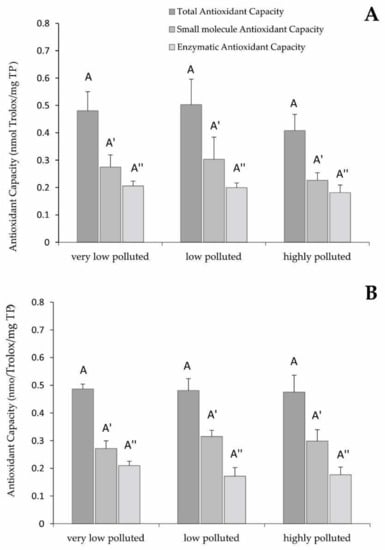 Figure 3. Total antioxidant capacity (sum of small molecules antioxidant capacity and enzymatic antioxidant capacity) of (A) S. cephalus and (B) P. bonelli liver. Values (nanomoles of Trolox per milligrams of total proteins) are indicated as mean ± SD. Different letters correspond to significant statistical differences (p < 0.005) among different sites (ANOVA test). P. bonelli: three specimens per site. S. cephalus: four specimens per site were singularly analysed.