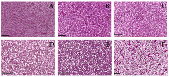 Figure 5. Lipid vacuolisation in liver of (AC) S. cephalus and (D,E) P. bonelli caught in the three different rivers with (A,D) very low, (B,E) low, and (C,F) high concentration of PFAS. Increasing vacuolisation was observed only in P. bonelli liver, and it was proportional to increasing hepatic PFAS concentration (from 139.25 µg/kg per whole body weight). Scale bars indicate 50 µm. Six specimens per site.