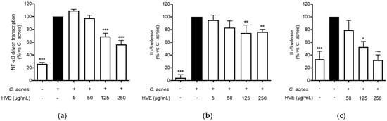 Effect of HVE treatment (5–250 μg/mL) on the NF-κB-driven transcription (a) for 6 h, IL-8 release (b), and IL-6 release (c) in HaCaT cells infected with C. acnes (O.D. = 0.1) for 24 h. Apigenin (20 μM), representing the reference inhibitor, abrogated the NF-κB-driven transcription (−100%) and inhibited the release of IL-8 (−42%) and IL-6 (−97%). The amount of IL-8 in the stimulated condition was 426.41 ± 96.97 pg/mL. * p < 0.05, ** p < 0.01, *** p < 0.001 vs. stimulus.