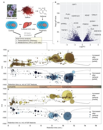 Overview of experiment and omics datasets. (A) Safranal is an active small molecule compound in saffron derived from the pistils of Crocus sativus. We performed RNAseq and HPLC–MS on extracts from safranal-treated and non-treated HCC cells. (B) Volcano plot showing transcript expression changes (x-axis) and negative log p-values (y-axis). (C,D) Mass-to-charge ratios (m/z; y-axis), retention time (x-axis), and fold-change (bubble size) of metabolites in response to safranal treatment (p < 0.001 for all shown features) in (C) cell pellet extracts or (D) conditioned media extracts. Yellow bubbles indicate increased, and blue indicates decreased compounds in HCC pellet extracts after safranal treatment.