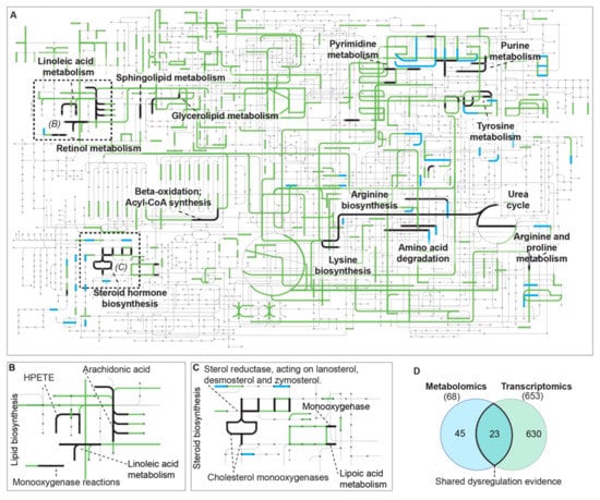 Overlap of metabolomic- and transcriptomic-predicted pathway dysregulation (as observed from cell pellets) in safranal-treated HCC cells. Maps show metabolites (gray dots), edges with no evidence (gray edges), transcriptomic reaction dysregulation evidence (green edges), metabolomic reaction dysregulation evidence (blue edges), and reaction dysregulation evidence from both omics experiments (bold black edges) after safranal treatment. Metabolites and their respective metabolic pathways were identified using LC/MS–QToF and Mummichog (http://mummichog.org/, accessed on 20 March 2021) in XCMS and their overlaps with those identified from RNAseq analysis (black edges, panels A–C). (A) Overview of metabolic dysregulation evidence from the dual omics experiments visualized in the Interactive Pathways Explorer v3 (https://pathways.embl.de/, accessed 29 May 2021). (B) Lipid biosynthesis dysregulation after safranal treatment (see also Table S2). (C) Steroid biosynthesis dysregulation after safranal treatment (see also Table S2). (D) Overlap of metabolomics and transcriptomics dysregulated metabolic reactions from CAS and EC numbers. Metabolite accessions were retrieved from the Chemical Abstract Service (CAS) using the METLIN (https://metlin.scripps.edu, accessed 4 May 2021) batch search tool, ECs were retrieved from transcripts using EC Domain Miner []. The CAS and EC accession numbers were compared in iPATH3 (https://pathways.embl.de/, accessed 29 May 2021) to detect dysregulated.