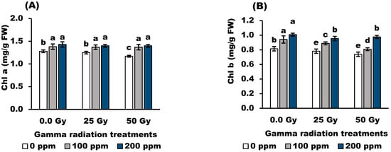 Leaf chlorophylls are indicators of chloroplast structure and are considered the central part of photosynthetic systems. Data in Figure 1 indicated that Chl a, Chl b, and carotenoids decreased significantly with 50 Gy gamma radiation doses. These results agree with the previous study [38] on barley plants. The reduction in photosynthetic pigments may be related to the increasing chlorophyll photo-oxidation and damage to the photosynthetic apparatus. Interestingly, the application of stigmasterol can alleviate the damaging effects of gamma radiation on photosynthetic pigment content. The increase in photosynthetic pigment in response to stigmasterol could be attributed to increased photosynthetic apparatus and antioxidant enzyme activities [5].