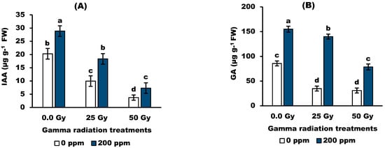 Effect of stigmasterol treatments on endogenous phytohormones; (A) IAA, (B) GA, and (C) ABA of wheat plants grown from grain irradiated with gamma rays. The different letters (a–d) show statistical significance at p < 0.05; vertical bars indicate ±SD.
