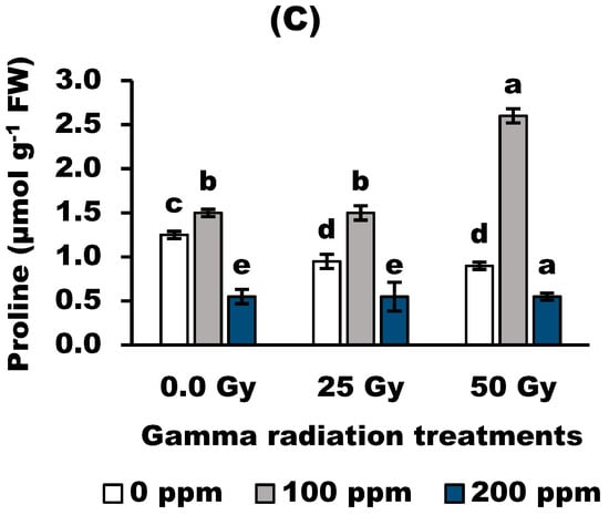 Gamma radiation at 25 Gy showed a non-significant effect on lipid peroxidation MDA), while 50 Gy significantly increased (p < 0.05) MDA compared with the control value. Moreover, foliar application of stigmasterol lowered (p < 0.05) the MDA content in treated plants below the control. Stigmasterol at 200 ppm decreased MDA by 25%, 25.2%, and 31.25%, respectively, in the control plants and the 25 Gy- and 50 Gy-irradiated plants.