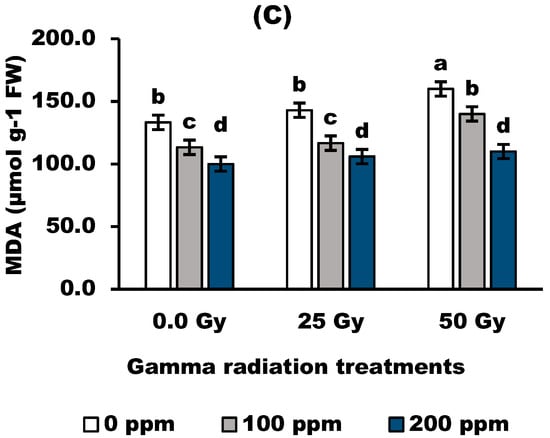 Effect of stigmasterol treatments on the activities of antioxidant enzymes; (A) CAT and (B) POD, and (C) lipid peroxidation of wheat plants grown from grain irradiated with gamma rays. The different letters (a–f) show statistical significance at p < 0.05; vertical bars indicate ±SD.
