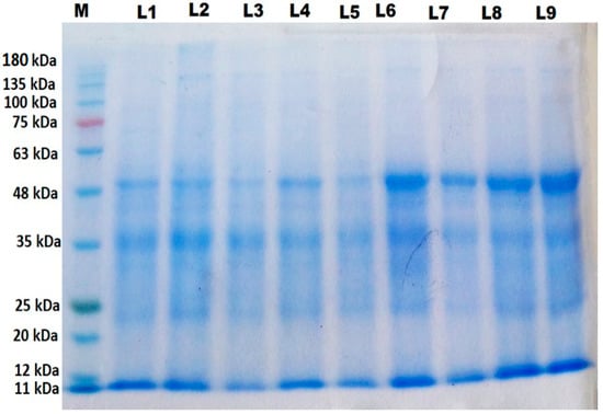 - Laemmli, U.K. Cleavage of Structural Proteins during the Assembly of the Head of Bacteriophage T4. Nature 1970, 227, 680–685. [Google Scholar] [CrossRef] [PubMed]