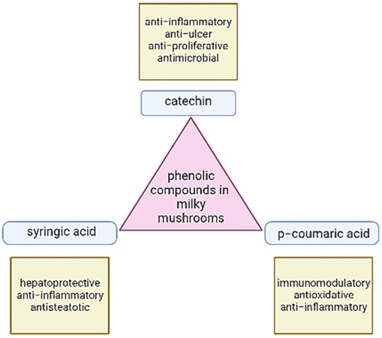 The presence of phenolic substances such as phenolic acids, hydroxycinnamic acids, lignans, tannins, flavonoids, hydroxybenzoic acids, stilbenes, and oxidized polyphenols has been linked to anti-inflammatory activities in the various mushrooms [60]. These substances have been characterized as free radical inhibitors, peroxide decomposers, metal inactivators, and oxygen scavengers [17]. Mushroom extracts have a high concentration of phenolic compounds that are mainly composed of one or more aromatic rings including one or more hydroxyl groups and can serve as hydrogen donors or electron donors, and possess metal ion-chelating characteristics [52]. Phenolic compounds present in milky mushrooms include catechin, syringic acid, p coumaric acid, and caffeic acid and their applications are listed in Figure 3. According to a study by Prameela (2020) [61], there is no specific association between the number of carbohydrates and pileus size, but there is a notable increase in the number of phenols as the size of the pileus grows.