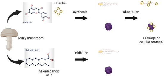 Resistance to antibiotics by pathogenic microorganisms has been a global problem in recent years, and both Gram-positive and Gram-negative bacteria have diverse mechanisms against antimicrobial drugs, demanding the development of a novel and efficient alternative against these microorganisms [48]. Mushrooms contain a variety of bioactive chemicals with strong antimicrobial activity against both Gram-positive and Gram-negative bacteria. Many of the extracellular secretions of the mushroom mycelium have been proven to inhibit bacteria and viruses. Through this mechanism, the binding and synthesis of catechin and hexadecenoic acid to the bacterial cell wall are responsible for antimicrobial activity against Escherichia coli and Staphylococcus aureus (Figure 4). Furthermore, using the gas chromatograph-mass spectrometer (GCMS) approach, many phytocompounds such as ethyl tridecanoate, undecanoic acid ethyl ester, diallyl divinylsilane, and 3-phenyl-pyrrolo (2,3-) pyrazine were identified and reported to have antimicrobial characteristics [59].