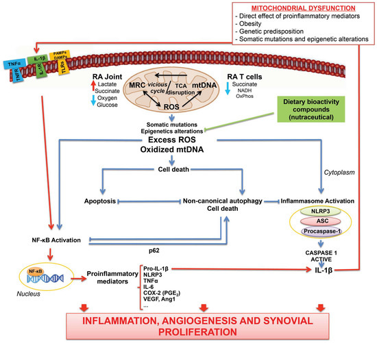 Theoretical model for the multidirectional interplays between mitochondrial oxidative stress, metabolic status, inflammation and cell death in RA. Mitochondria play essential roles at the crossroads of metabolism and innate immunity [54]. Thus, mitochondrial dysfunction derived from several danger signals could activate TCA disruption and thereby favoring a vicious cycle of oxidative/mitochondrial stress. In fact, oxidative damage in synovial tissue is associated with in vivo hypoxic status, high lactate and low glucose levels [3]. Mitochondrial dysfunction can act through modulating innate immunity via redox-sensitive inflammatory pathways (i.e., NF-κB) or direct activation of the inflammasome. Inflammasome activation and NF-κB pathway could work together to activate inflammatory cytokines, thereby leading to overstimulation of the inflammatory response. On the other hand, mitochondria also have a central position in regulating cell death. In this sense, the two main regulated cell death pathways, apoptosis and autophagy, cooperate in a balanced interaction that promotes cell survival or cell death. Additionally, NF-κB could restrict inflammasome activation via elimination of damaged mitochondria through p-62-dependent clearance of damaged mitochondria as well as autophagy modulate NF-κB activation [135]. Additionally, multiple evidence suggests that pathological processes in RA can be shaped by epigenetic mechanisms and that mitochondria are involved in epigenetic regulation [241]. Natural bioactive agents of a healthy diet could protect mitochondria and inhibit the overactivation of mitochondrial oxidative stress and the associated inflammatory response that define RA.