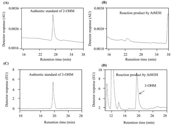 Due to the low homology (40%) between OsM3H and AtM3H, we examined whether AtM3H has M3H activity. Full-length AtM3H was expressed in-frame with the coding sequence of the amino-terminal hexahistidine in Escherichia coli and induced by IPTG (Figure 2A). Soluble recombinant AtM3H was purified using a nickel affinity column. The recombinant proteins had 98% homogeneity, as determined by sodium dodecyl sulfate-polyacrylamide gel electrophoresis (SDS-PAGE) and Coomassie staining. AtM3H exhibited M3H activity of 125 pkat/mg protein but no M2H activity (Figure 2B). By contrast, rice OsM3H showed M3H and M2H activities, although its M2H activity was low []. Chromatograms of 2-OHM and 3-OHM authentic compounds, and AtM3H reaction products, are shown in Figure 3.