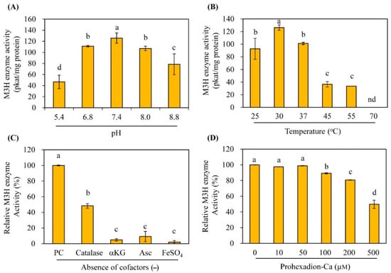 Kinetics of purified AtM3H. M3H activity as a function of (A) pH and (B) temperature. (C) Effects of cofactors on M3H activity. (D) Effect of prohexadione-Ca on M3H activity. Means ± SD of three replicates. Different letters (a–d) indicate significant differences at p < 0.05. PC, M3H activity with all cofactors; α-KG, α-ketoglutarate; Asc, ascorbic acid; nd, not detected.