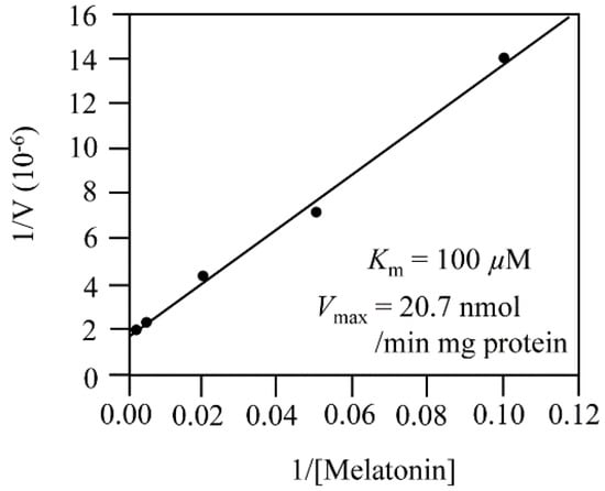 The optimum pH of M3H was pH 7.3, but M3H activity was high at pH 6.8–8.8 (Figure 4). The optimum temperature was 30 °C, followed by 37 °C and 25 °C; activity was absent at 70 °C. The optimum pH and temperature of AtM3H are similar to those of rice OsM3H, which also exhibited the optimum pH (7.4–8.0) and temperature (30 °C) [,]. AtM3H required α-ketoglutarate as a cosubstrate and several cofactors (ascorbate, Fe2+, and catalase); the absence of these factors markedly reduced or abolished AtM3H activity (Figure 4). At 100 and 500 μM, the 2-ODD inhibitor prohexadione-Ca decreased AtM3H activity by 10% and 50%, respectively. By contrast, 10 μM prohexadione-Ca reduced OsM2H activity by 90% []. Therefore, AtM3H was more tolerant of prohexadione-Ca than M2H (Figure 4D). Using the above optimum conditions, the Km and Vmax values of AtM3H were 100 μM and 20.7 nmol/min mg protein, respectively (Figure 5). The Km of AtM3H was sevenfold lower than that of OsM3H, whereas the Vmax was 10-fold lower. The catalytic efficiency (Vmax/Km) of AtM3H was 1.3-fold lower than that of OsM3H. Therefore, AtM3H is a member of the 2-ODD superfamily and has a catalytic efficiency similar to rice OsM3H.
