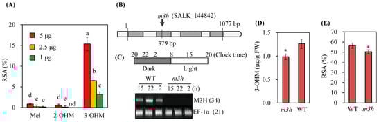 Schematic diagram of the genome structure and antioxidant activity of m3h. (A) Antioxidant activities of melatonin, 2-OHM, and 3-OHM revealed by DPPH assay. (B) Schematic of the T-DNA insertion site (downward arrow) in M3H. Gray and white boxes indicate exons and introns, respectively (not to scale). (C) Expression of M3H in the WT and m3h revealed by RT-PCR over 24 h. Numbers in parentheses are numbers of PCR cycles. Elongation factor-1 alpha (EF-1α) (AT5g60390) served as the loading control. (D) 3-OHM levels in leaves of the WT and m3h infiltrated with melatonin (100 µM). (E) Antioxidant activities of lower leaves of 30-day-old WT and m3h, as revealed by DPPH assay. Error bars are standard deviations of three biological replicates. Different letters and asterisks (*) indicate significant differences (Tukey’s post hoc HSD test; p < 0.05). RSA, radical scavenging activity.