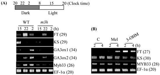 Expression profiles of flowering-related genes in the WT and m3h. (A) Daily expression of FLOWERING LOCUS T (FT) and gibberellin (GA)-related genes in the WT and m3h. (B) Expression levels of FT, KS, and MYB33 in WT leaves in response to melatonin and 3-OHM (4 μM). Transcript levels were analyzed by RT-PCR using cDNA from leaves of 30-day-old mature plants before the bolting stage. Plants were sampled at the indicated times. EF-1α was used as the loading control. Numbers in parentheses are numbers of PCR cycles. Effector solutions were infiltrated into the abaxial leaf side at 8 pm and incubated for 2 and 4 h in darkness. Accession numbers: FT, AT1G65480; KS, AT1g15550; GA3ox1, AT1g80340; GA3ox2, AT5g06100; MYB33, AT5g60390; and EF-1α, AT5g60390.