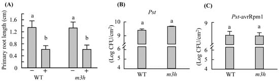 Stress responses of the WT and m3h. (A) Root length in response to salt stress. Seeds were sown on MS medium in the absence (−) and presence (+) of 100 mM NaCl and vertically positioned for 3 weeks. (B) Bacterial growth in response to virulent P. syringae pv. tomato DC3000 (Pst). (C) Bacterial growth in response to avirulent P. syringae pv. tomato DC3000 containing avrRpm1 (Pst-Rpm1). Bacteria were spray-inoculated at 5 × 106 (Pst) or 1 × 108 CFU/mL (Pst-Rpm1) (in 0.01% [v/v] Silwet L-77), and their growth was determined at 5 days post-infection. Experiments were conducted in triplicate. Different letters indicate significant differences (Tukey’s post hoc HSD test; p < 0.05). CFU, colony-forming units.