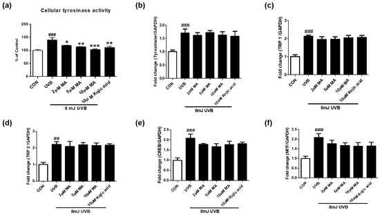 We tested whether maclurin regulates cellular tyrosinase activity and mRNA levels of genes related to melanogenesis in UVB-exposed B16F10 cells. Maclurin treatment (2–10 µM) significantly decreased the activity of cellular tyrosinase post UVB exposure (8 mJ) (Figure 3a). Although UVB exposure significantly elevated mRNA levels of genes related to melanogenesis, MITF, cAMP-response element-binding protein (CREB), tyrosinase, tyrosinase-related protein (TRP1), and TRP2, maclurin treatment did not alter the mRNA levels of these genes (Figure 3b–f). These data suggest that maclurin inhibits UVB-induced melanin accumulation partly via inhibiting cellular tyrosinase activity.