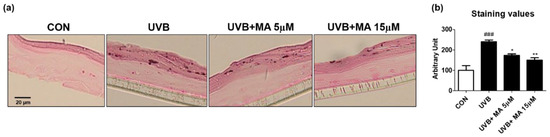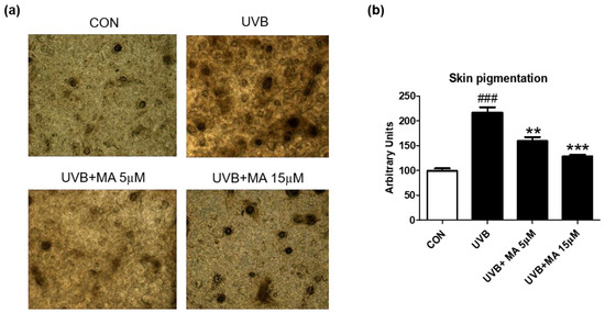 Fontana-Masson staining results in 3D artificial human skin pretreated with maclurin. The pigmented human skin model (Neoderm-ME) was pretreated with maclurin and exposed to UVB radiation, followed by incubating in the maintenance media offered by the company for 5 days. (a) Fontana-Masson staining images showed differences in melanosome in the epidermis of the pigmented human skin model. (b) Fontana-Masson staining images were analyzed by the Image J analysis software. The results were represented the mean value ± SEM at least three times. All data were compared by ANOVA, followed by Dunnett’s multiple comparison test. ### p < 0.001 compared with the control group and * p < 0.05, ** p < 0.01 compared to the UVB-exposed group.