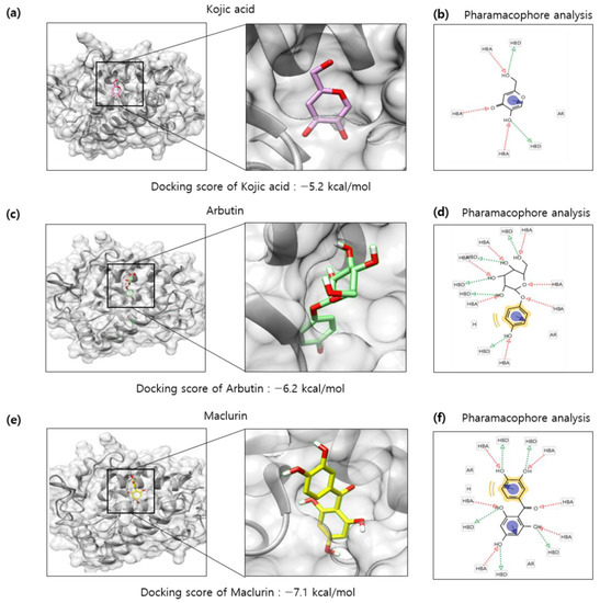 In silico docking simulation of tyrosinase and maclurin. Protein-ligand docking simulation was performed using AutoDock Vina. It was analyzed between human tyrosinase (5I38) and (a) kojic acid, (c) arbutin, and (e) maclurin as a receptor and ligands, respectively. In a marked square box, it represents the tyrosinase binding site with an enlarged image. The binding residues analysis of (b) kojic, (d) arbutin, or (f) maclurin with tyrosinase was performed by pharmacophore analysis.