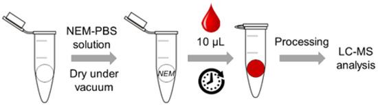 Ten microliters of blood samples were directly added to the papers pre-soaked with NEM and allowed to derivatize (GSH-NEM formation) at room temperature (RT) for 5 min. Then, they were kept at least 3 h and up to 24 h at 4 °C until further processing. Then, 100 μL of cold PCA solution (4%, v/v) were added to the precipitate proteins. To extract analytes of interest, Eppendorf tubes were placed in a thermal mixer for 5 min at 4 °C at 1400 rpm followed by 5 min of sonication. Finally, samples were centrifuged at 10,000× g for 15 min at 4 °C, and 40 μL of supernatants were diluted with 60 μL of H2O (0.1% FA, v/v) and 5 μL of internal standard (IS) solution containing isotopically labelled GSH-NEM and GSSG at 100 μmol/L each. Thereafter, samples were stored at −80 °C until analysis. Paper card treatment with NEM and the sample collection and processing scheme are represented in Figure 1.