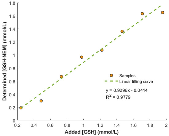 Individual papers were treated with increasing amounts of NEM (i.e., 2, 4, 5, 6, 8, and 10 μmol). After drying under vacuum, papers pre-soaked with NEM were stored at 4 °C until the next day. Figure S1 (see Supporting Information) shows GSH-NEM and GSSG values of the same whole blood sample deposited on DBS paper cards pre-soaked with increasing amounts of NEM. As can be seen, GSSG values reached a plateau when ≥8 μmol of NEM were employed. Then, the efficiency of GSH derivatization, a critical step to avoid GSH oxidation, was evaluated by adding increasing amounts of GSH (0.25–2 mmol/L) onto DBS paper cards pre-soaked with NEM. As shown in Figure 2, the derivatization successfully occurred under the assayed conditions. On the other hand, when a whole blood sample was processed using papers without NEM, a decrease in GSH-NEM (0.90 ± 0.03 vs. 0.20 ± 0.01 mmol/L) and a huge concomitant increase in GSSG were observed (3.1 ± 0.3 vs. 276 ± 18 µmol/L), thus confirming the need for an immediate derivatization of GSH with NEM upon sample collection.