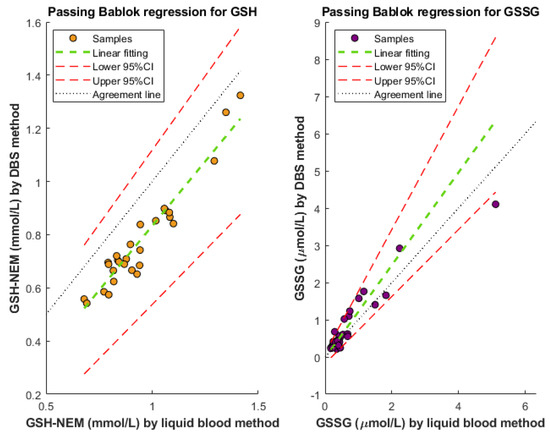 Passing–Bablok regression for GSH-NEM (left) and GSSG (right) for the comparison between the proposed DBS method and a previously developed method for liquid blood samples.