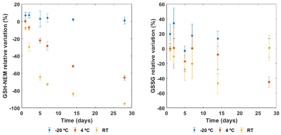 GSH-NEM and GSSG relative variation testing three different conditions (room temperature (RT), 4 °C, and −20 °C) from 1 to 28 days.
