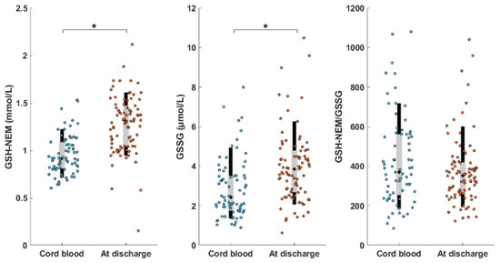 GSH-NEM and GSSG concentrations, and the GSH-NEM/GSSG of cord blood and blood samples collected at discharge. Black bars represent 10th–90th percentile; grey bars represent interquartile range (I–III), + represents median values. Note: * indicates p-value < 0.001; Wilcoxon rank sum test.