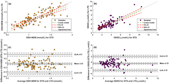 Regression line between GSH-NEM (a) and GSSG (b) concentrations measured under short- and long-term storage conditions (STS and LTS, respectively). Bland–Altman plot for GSH-NEM (c) and GSSG (d) comparing STS and LTS conditions. Note: CI, 95% confidence interval; LLA, lower limit of agreement; ULA, upper limit of agreement.