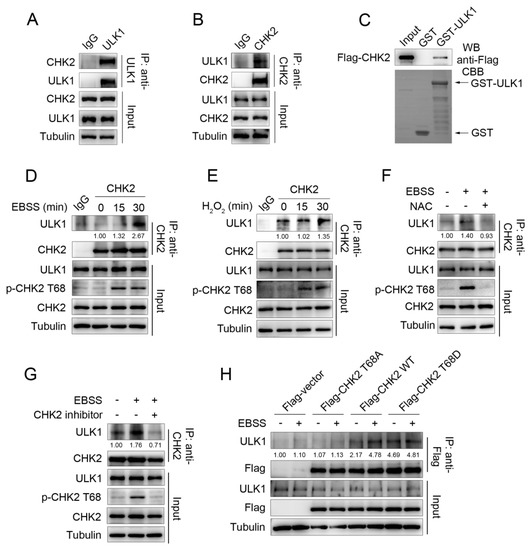 Our previous study found that metabolic stress can promote autophagy to maintain cellular homeostasis by activating CHK2. To further explore the molecular mechanism of CHK2 regulating autophagy, we screened CHK2 binding proteins through the candidate approach. We performed a co-immunoprecipitation (Co-IP) assay and showed that endogenous CHK2 co-precipitates with endogenous ULK1 (Figure 1A,B). Next, using an in vitro glutathione S-transferase (GST) pull-down assay, we found that CHK2 can directly bind to ULK1 (Figure 1C). Furthermore, enhanced binding between ULK1 and CHK2 was observed in response to metabolic and oxidative stress (Figure 1D,E). N-acetylcysteine (NAC) is a widely used oxygen radical scavenger. The interaction was significantly reduced by using NAC (Figure 1F), indicating that ROS are signaling molecules that facilitate the binding of CHK2 and ULK1. We found that the enhanced binding between these two proteins was accompanied by the activation of CHK2 Thr68. Next, CHK2 inhibitors significantly reduced its phosphorylation at Thr68 and the interaction between CHK2 and ULK1 under metabolic stress (Figure 1G). In addition, under metabolic stress, the binding between wild-type (WT) CHK2 and ULK1 was enhanced, whereas the binding of T68A CHK2 mutant to ULK1 was not. Mimic threonine 68 phosphorylation of CHK2 (T68D) promotes its interaction with ULK1, even under non-metabolic stress (Figure 1H). Taken together, the binding of CHK2 to ULK1 is dependent on the phosphorylation of CHK2 Thr68.