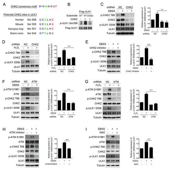 CHK2 phosphorylates ULK1 at Ser556. (A) Clustal alignment of the conserved sites in ULK1 matching the optimal CHK2 substrate motif. (B) In vitro CHK2 kinase assay using CHK2 recombinant human protein with FLAG-ULK1WT and FLAG-ULK1S556A as substrates, followed by immunoblotting analysis. (C,D) Western blot analysis with the indicated antibodies in H1299 cells with CHK2 knockdown. Cells were treated with EBSS (C) or H2O2 (500 μM) (D). (E) Western blot analysis with indicated antibodies in H1299 cells pretreated with CHK2 inhibitor for 3 h and treated with EBSS for 1 h. (F,G) Western blot analysis with indicated antibodies in H1299 cells with ATM knockdown. Cells were treated with EBSS (F) or H2O2 (500 μM) (G). (H) Western blot analysis with the indicated antibodies in H1299 cells pretreated with ATM inhibitor for 3 h and treated with EBSS for 1 h. (I) Western blot analysis with the indicated antibodies in H1299 cells pretreated with NAC for 4 h and treated with EBSS for 1 h. The results from three independent experiments are presented as mean ± SEM. ** p < 0.05, *** p < 0.001.