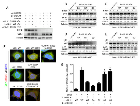 CHK2-mediated ULK1 phosphorylation promotes autophagy. (A) Western blot analysis with reconstituted expression of the indicated proteins in H1299 cells. (B,C) Western blot analysis of p62and LC3 in H1299 cells with reconstituted expression of ULK1 WT, S556A mutant, or S556D mutant treated with EBSS for 3 h with (B) or without (C) CHK2. (D,E) Western blot analysis of p62 and LC3 in H1299 cells with reconstituted expression of ULK1 WT, S556A mutant, or S556D mutant treated with H2O2 (500 μM) for 3 h with (D) or without (E) CHK2. (F) The red puncta is shown by representative confocal microscopic images in 293 cells expressing the indicated plasmids treated with EBSS for 2 h. (G) Data are presented as mean ± SEM. * ULK1 SA mutant treated with EBSS compared to ULK1 WT treated with EBSS, p < 0.001; # ULK1 SD mutant compared to ULK1 WT, p < 0.001 and & ULK1 SD mutant treated with EBSS without CHK2 compared to ULK1 WT treated with EBSS without CHK2, p < 0.001. Scale bar, 10 μm.