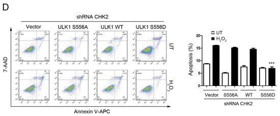 To test the role of CHK2-mediated phosphorylation of ULK1 in cell fate determination under stress conditions, we examined the effects of ULK1 WT, S556A, or S556D mutants on apoptosis, with or without CHK2 in the H1299 and HEK293 cell lines, in response to metabolic and oxidative stresses. The WT and S556D mutant reduced the number of cells undergoing apoptosis compared to the control, while the S556A mutant had no effect in response to metabolic and oxidative stress (Figure 4A,C, Supplementary Figure S2A,C). In addition, compared with CHK2-expressing cells, we found that apoptosis under stress was increased in CHK2-knockdown cells, even after expressing ULK1 WT (Figure 4B,D, Supplementary Figure S2B,D).