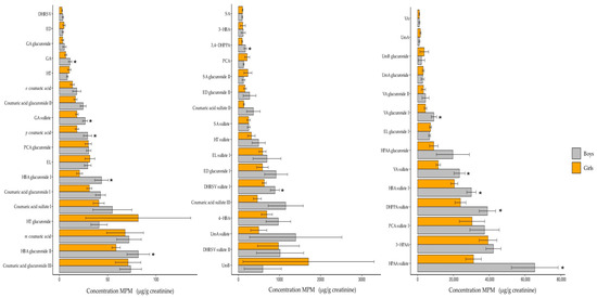 Differences in urinary MPM between boys and girls are shown in Figure 1. Boys had higher values of 3,4-dihydroxyphenylpropionic, dihydroxyphenylpropionic sulfate, gallic acid, gallic acid sulfate, p-coumaric acid, vanillic acid glucuronide and sulfate, hydroxybenzoic acid glucuronide-I and sulfate-I, protocatechuic acid sulfate, 3-hydroxyphenylacetic acid and hydroxyphenylacetic acid glucuronide and sulfate than girls. Our findings are in line with those of Zamora et al., who observed that the median urinary concentrations of tyrosol, vanillic acid, and 4-hydroxyphenylacetic acid were at least 1.4-fold higher in men than women [31]. Similarly, Mumford et al., found higher values of enterodiol and enterolactone in females than males [34]. As sex hormones may be responsible for these differences [8,35], a limitation of the current study is that the follicular phase of the menstrual cycle was not considered during the urine collection to minimize bias related to the hormonal status of the participants.